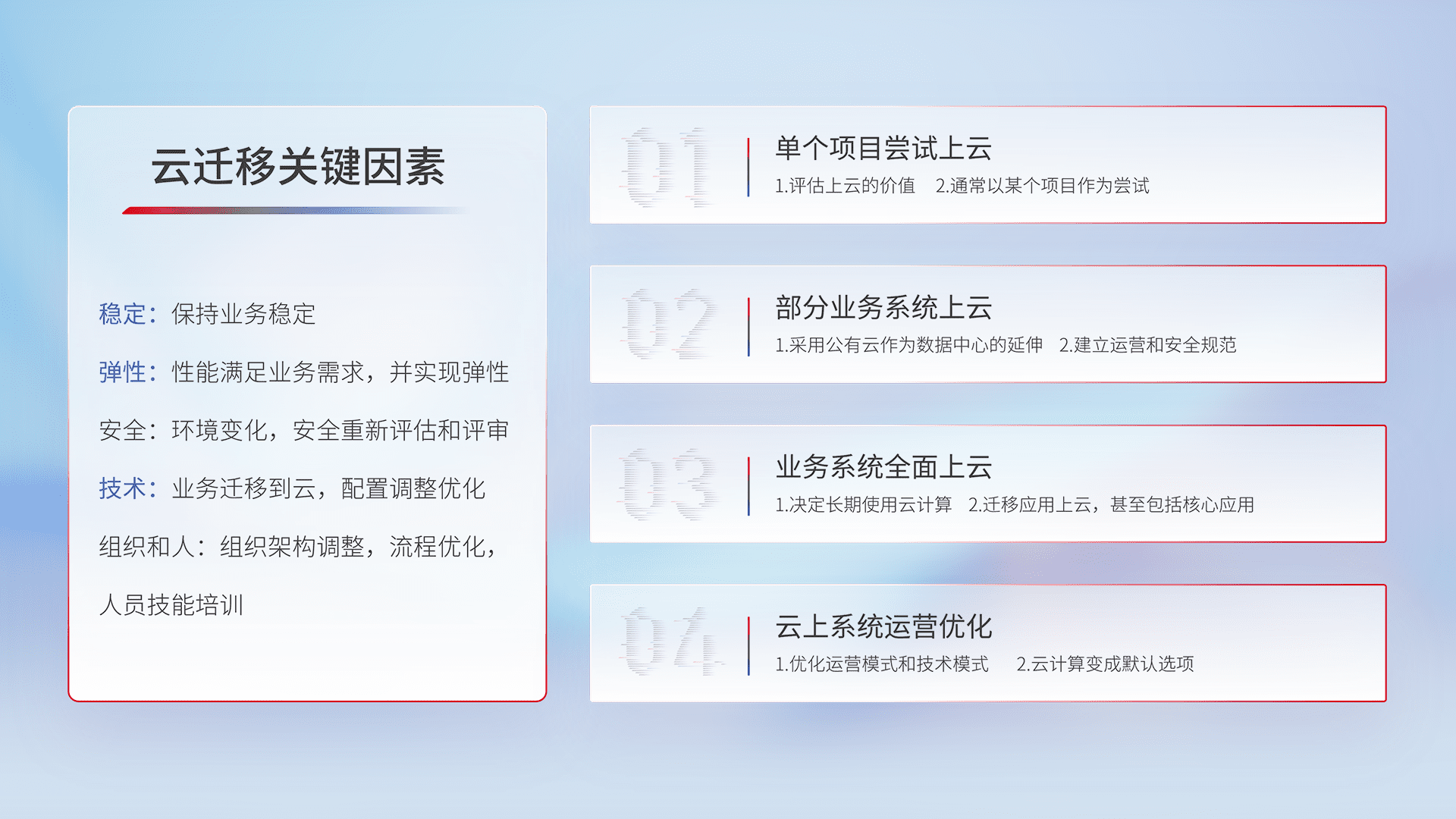 结合实际业务,,,从规划设计、、、、云平台选型、、云原生改造、、数据迁移、、集成交付,,,迁移全过程为客户识别最佳上云路径,,,做好风险识别管理,,,设计网络架构、、、、身份权限、、、安全审计合规、、、操作审计、、、日志审计、、、监控告警策略、、、、多站点容灾设计等,,,对云上基础设施进行整体规划,,,,提升IT治理水平,,,,以满足弹性、、、、高可用、、、高性能的需求。。