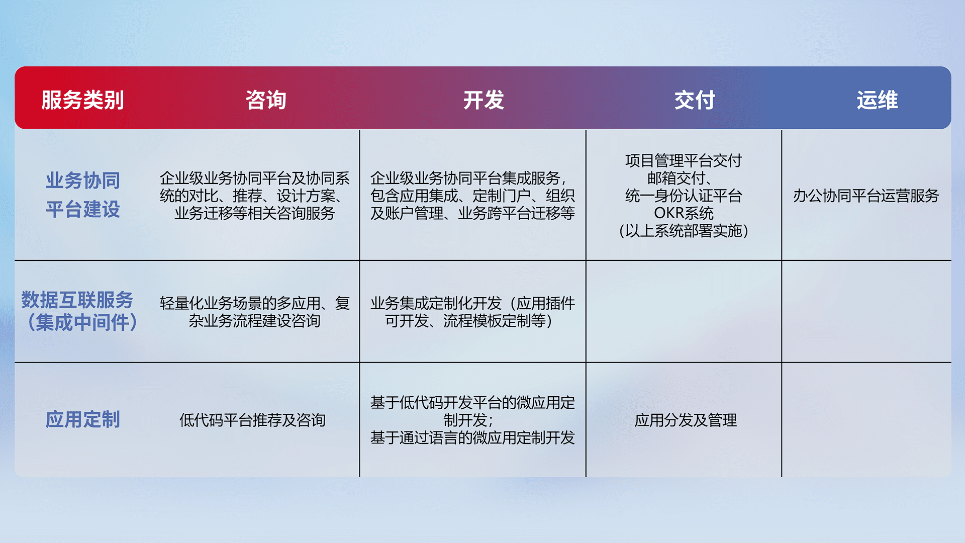 针对钉钉、、企微、、、IDaas等平台级产品提供产品的规划、、、方案、、、、交付、、、、定制化开发等服务,,实现如统一协同办公、、智能客户服务、、混合会议管理、、智能数据查询、、、、等业务场景,,,实现数字化转型。。。。